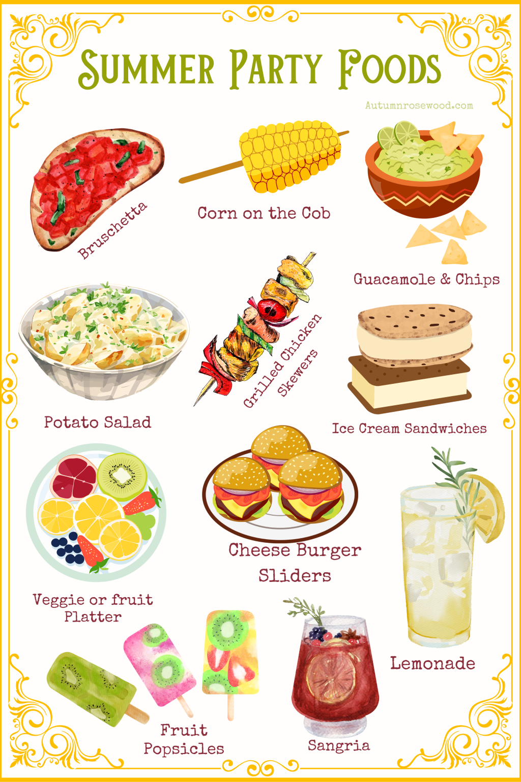 I put together this charming little visual list of some of my favorite Summer Party Foods, and I thought I’d share a few ideas for how to bring them to life at your next warm-weather gathering.