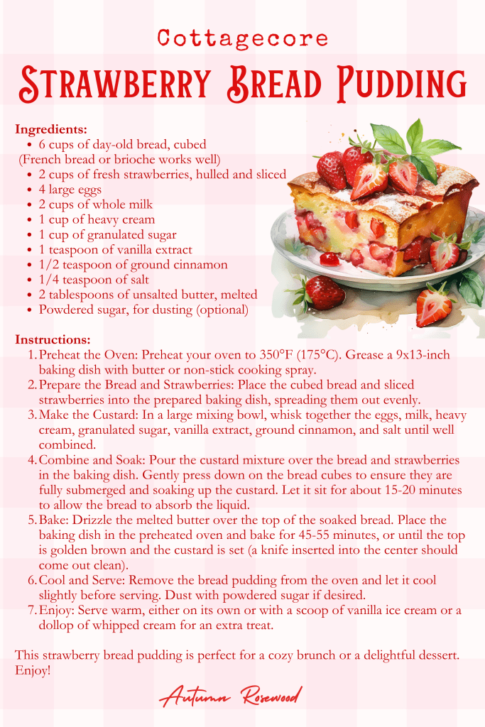 Bread pudding is one of those classic recipes that have been passed down through generations, and it’s easy to see why. The combination of custard-soaked bread and sweet, juicy strawberries is both comforting and satisfying. This recipe is perfect for those who love the simple pleasures of life, much like the cottagecore lifestyle itself.