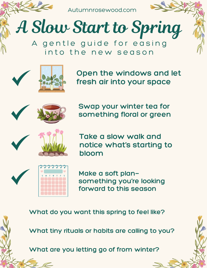 I put together a gentle, one-page printable to go along with this post. A little seasonal companion to help you welcome spring in your own time and way. It includes a short checklist of soft rituals and a few quiet prompts to help you move into the new season more mindfully.