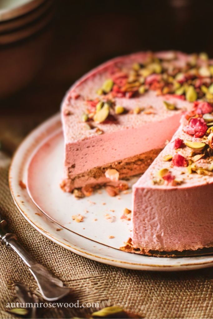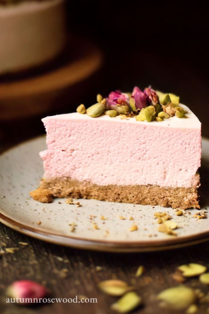 This isn’t a heavy cheesecake or a pudding, it’s a mousse cake. The texture is feather-light and mousse-like, with a subtle rose milk flavor that comes through beautifully thanks to Wabry’s organic rose syrup, which is naturally colored with beet juice and free of anything artificial.
