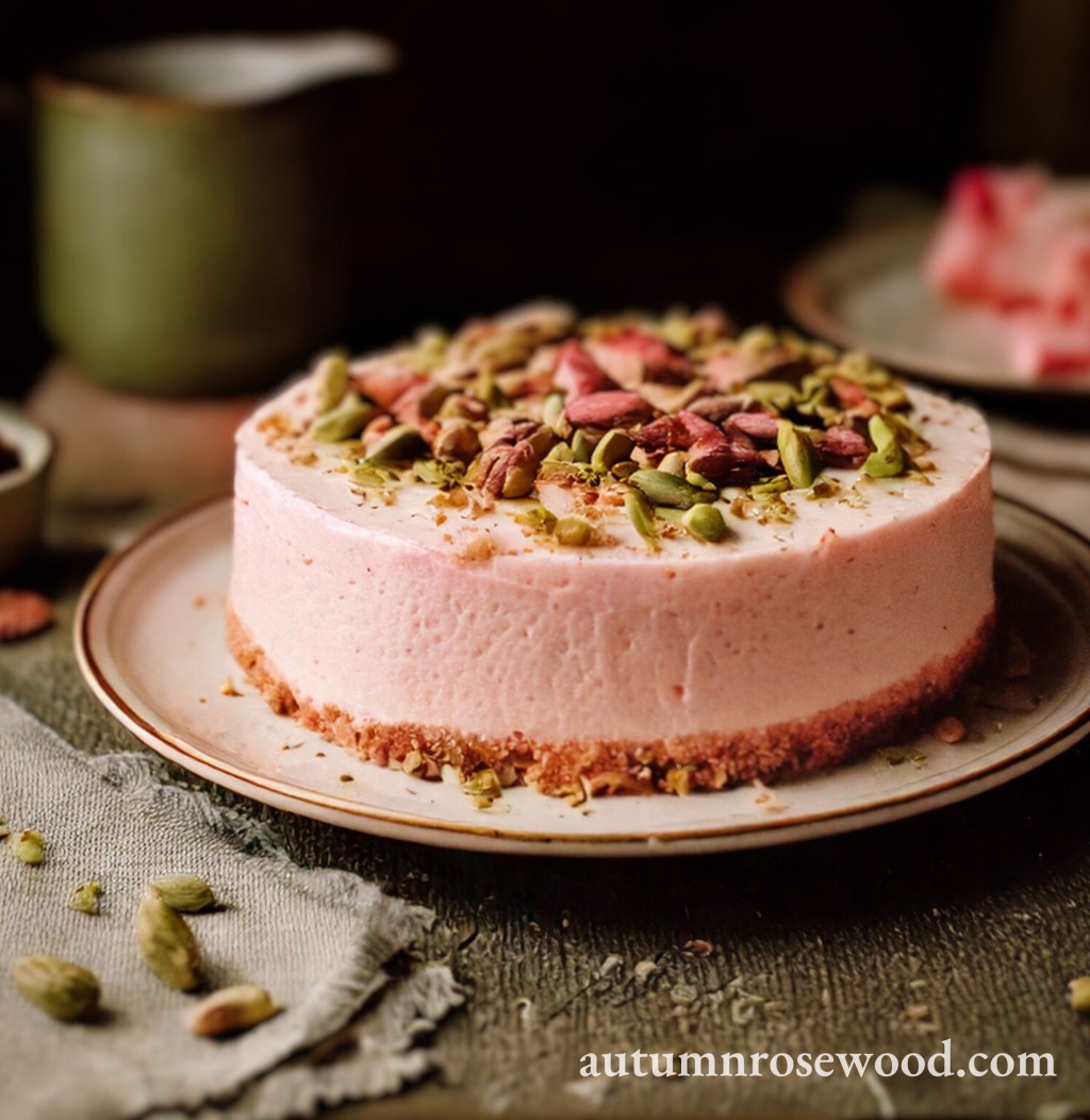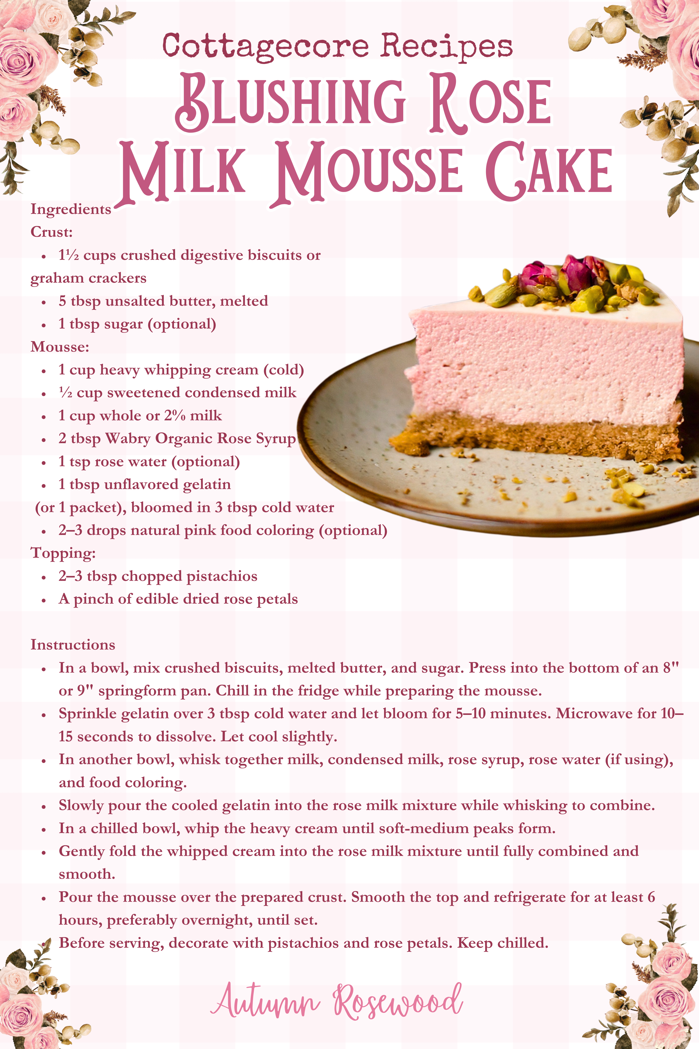 It’s a no-bake mousse cake made with Wabry Organic Rose Syrup, naturally tinted to a soft blush, layered over a buttery biscuit crust and finished with crushed pistachios and rose petals. The texture is light and airy, the flavor is floral and dreamy, and while you might find rose-flavored mousses or cakes out there, this exact combination? It’s something I made entirely my own.