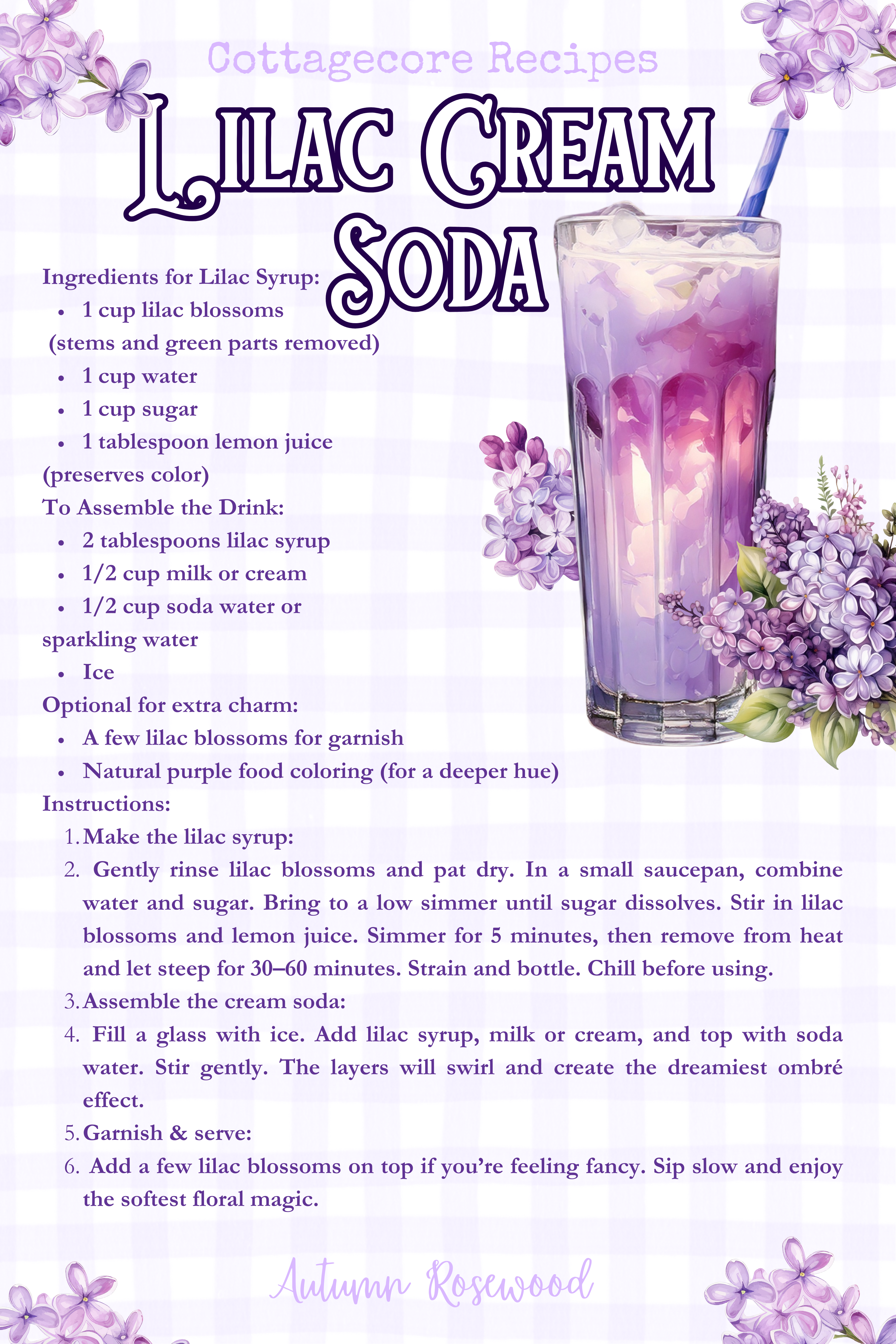 Gently rinse lilac blossoms and pat dry. In a small saucepan, combine water and sugar. Bring to a low simmer until sugar dissolves. Stir in lilac blossoms and lemon juice. Simmer for 5 minutes, then remove from heat and let steep for 30–60 minutes. Strain and bottle. Chill before using. - Assemble the cream soda: