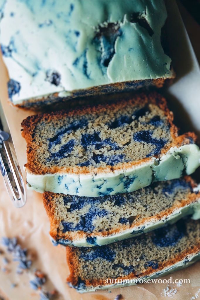 Whisk together powdered sugar and milk. Divide if you’d like to tint part with butterfly pea powder and a drop of lemon juice. Drizzle and swirl over the cooled loaf.
