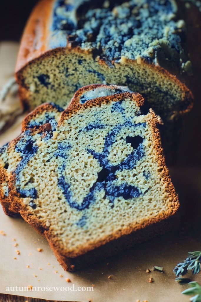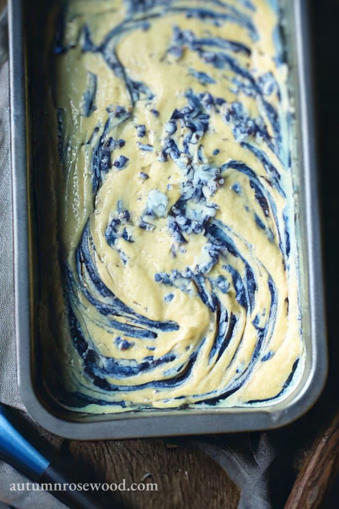 Pour half the batter into the pan. Spoon small amounts of the butterfly pea paste over the batter and swirl with a knife or skewer. Repeat with the remaining batter and more swirl on top. - Bake for 45–55 minutes, or until a toothpick inserted in the center comes out clean. Let cool in the pan for 10 minutes, then transfer to a rack to cool completely.