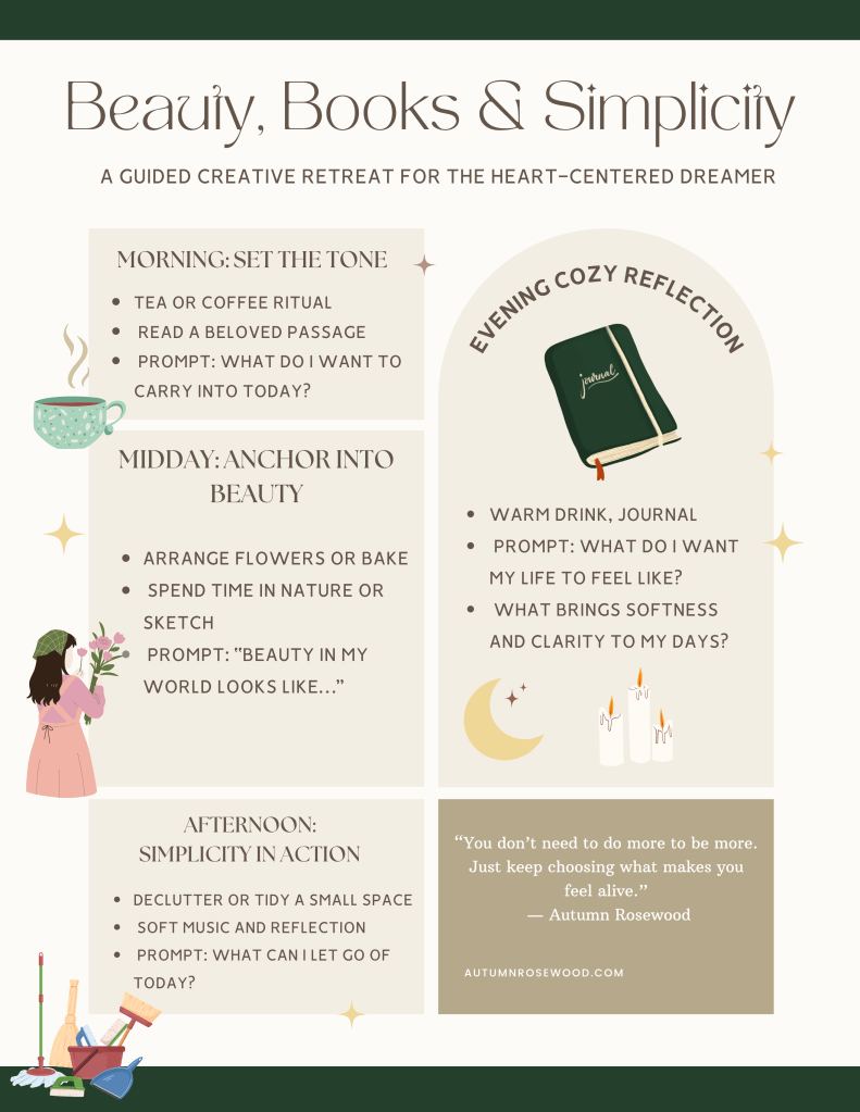 I’ve put together a one-page printable called Beauty, Books & Simplicity. A gentle guide to help you slow down, reconnect with yourself, and find creative clarity in the everyday. It’s the kind of day I wish for everyone.