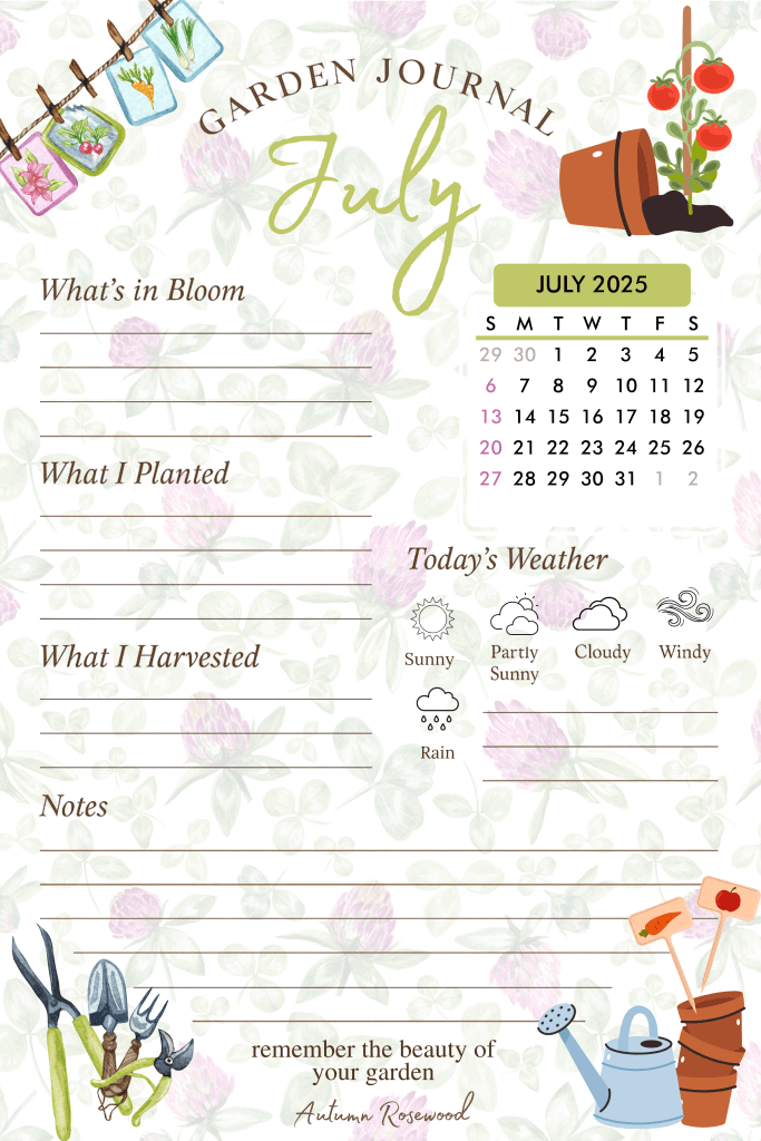 I wanted a soft place to keep track of it all, what’s growing, what’s blooming, what I’ve planted, and little notes I’ll want to remember next year. So I made a simple garden journal page for July, and I thought you might like it too.