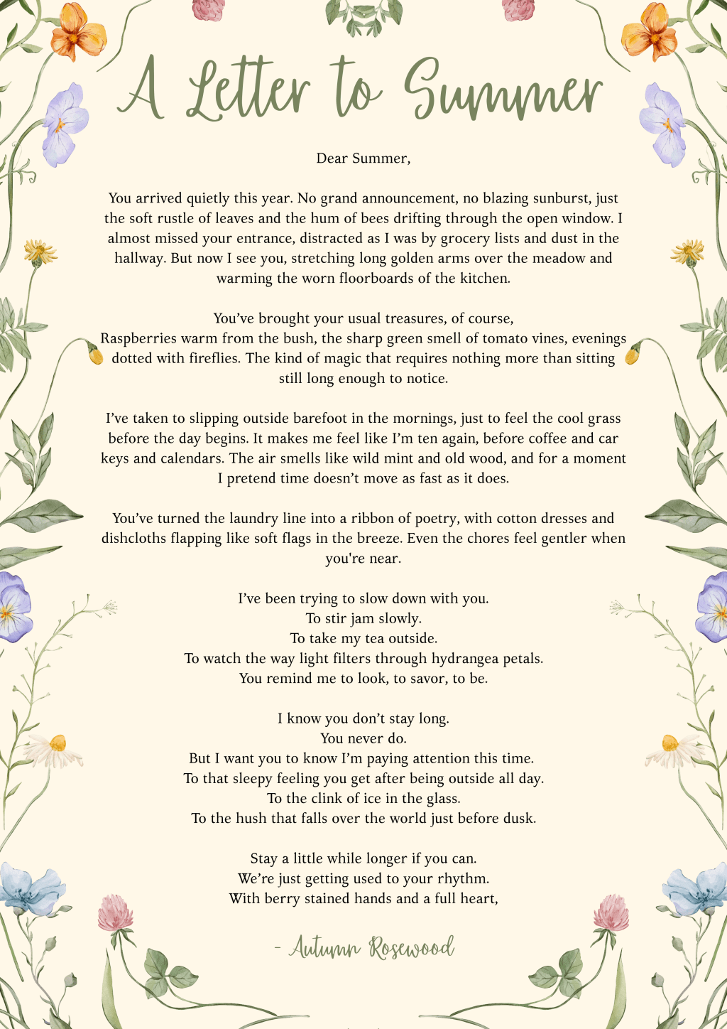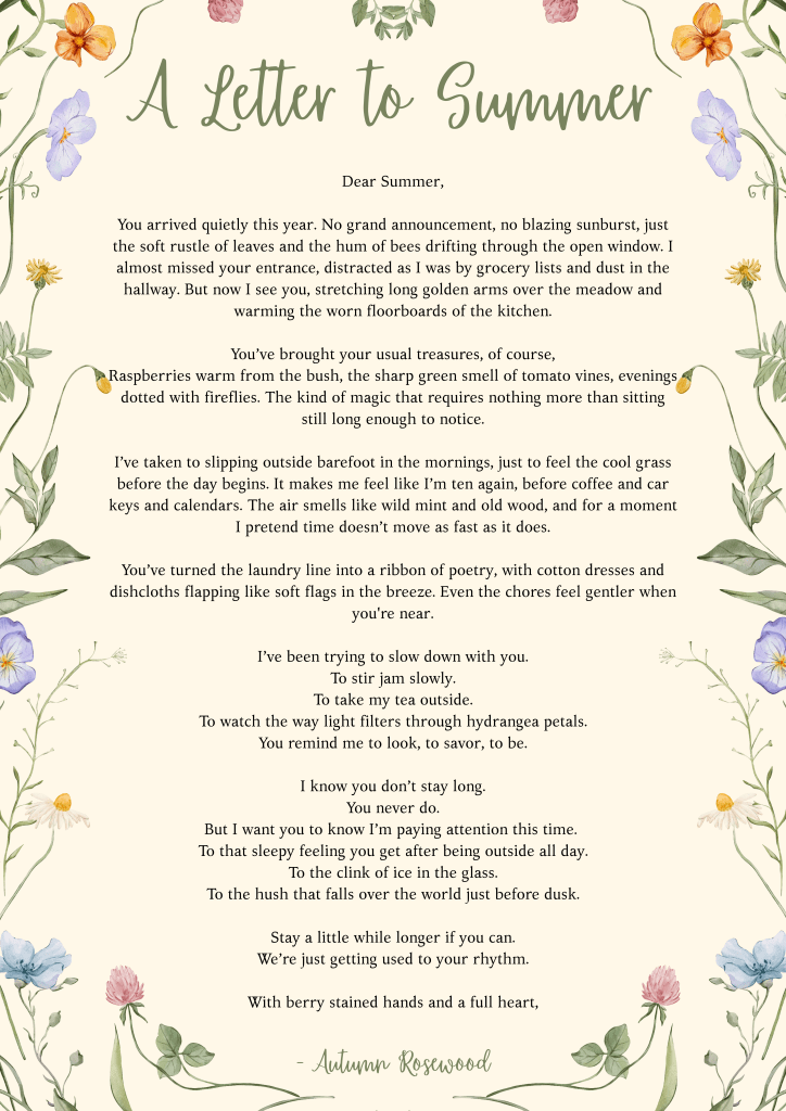 You arrived quietly this year. No grand announcement, no blazing sunburst, just the soft rustle of leaves and the hum of bees drifting through the open window. I almost missed your entrance, distracted as I was by grocery lists and dust in the hallway. But now I see you, stretching long golden arms over the meadow and warming the worn floorboards of the kitchen.