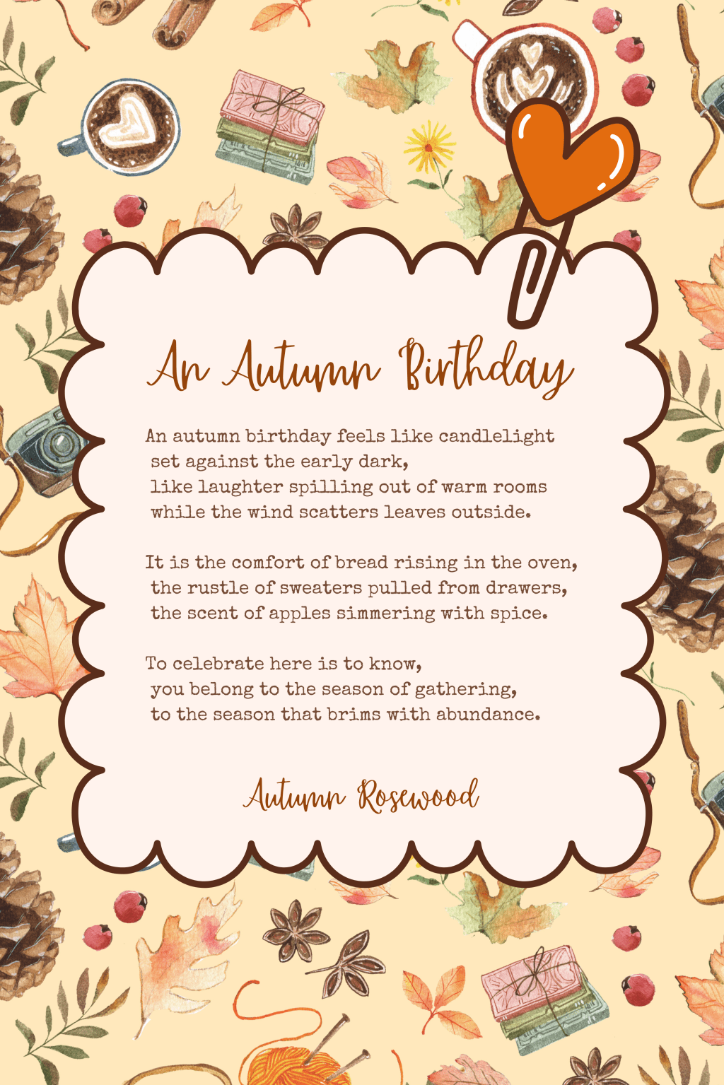 I think that’s why I wanted to mark my birthday differently this year, not with balloons or candles, but with something I could share. A little gift for you, because if you’re here, you’ve become part of this season with me. I wrote this poem as a little gift for the season, a reminder of the beauty that an autumn birthday carries. You can keep it close for yourself, or pass it along to someone you love who celebrates their birthday in this golden stretch of the year. After all, birthdays feel sweeter when they’re shared.