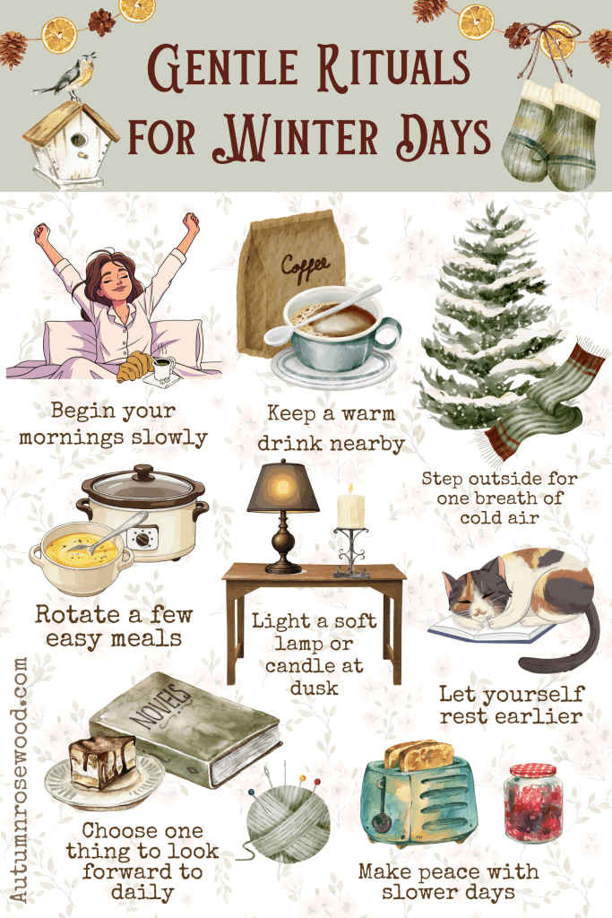 • Shorter days in every sense – not just the sun, but the expectations. Fewer tasks. Slower mornings. Earlier nights.