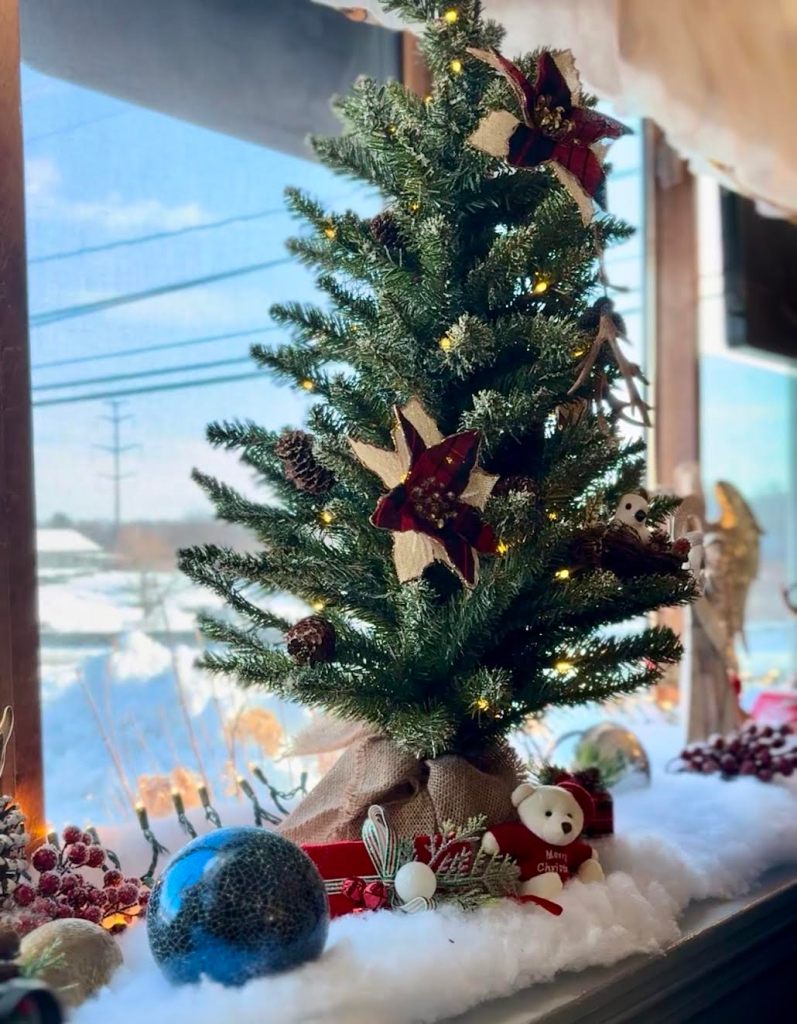 The diner was already warm when we stepped inside, the kind of warmth that feels earned in December. A little Christmas tree sat beside our booth, its lights blinking softly against the cold outside. It wasn’t decorated with any big plan in mind, just a handful of ornaments someone probably brought in from home. I loved that about it.